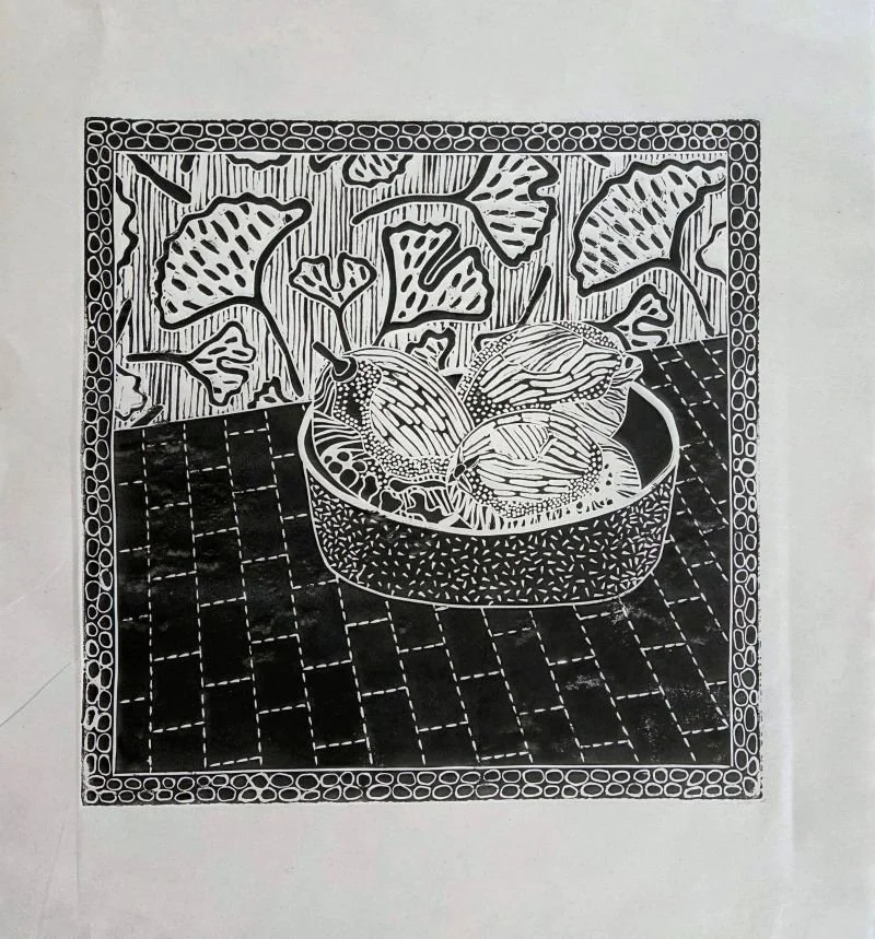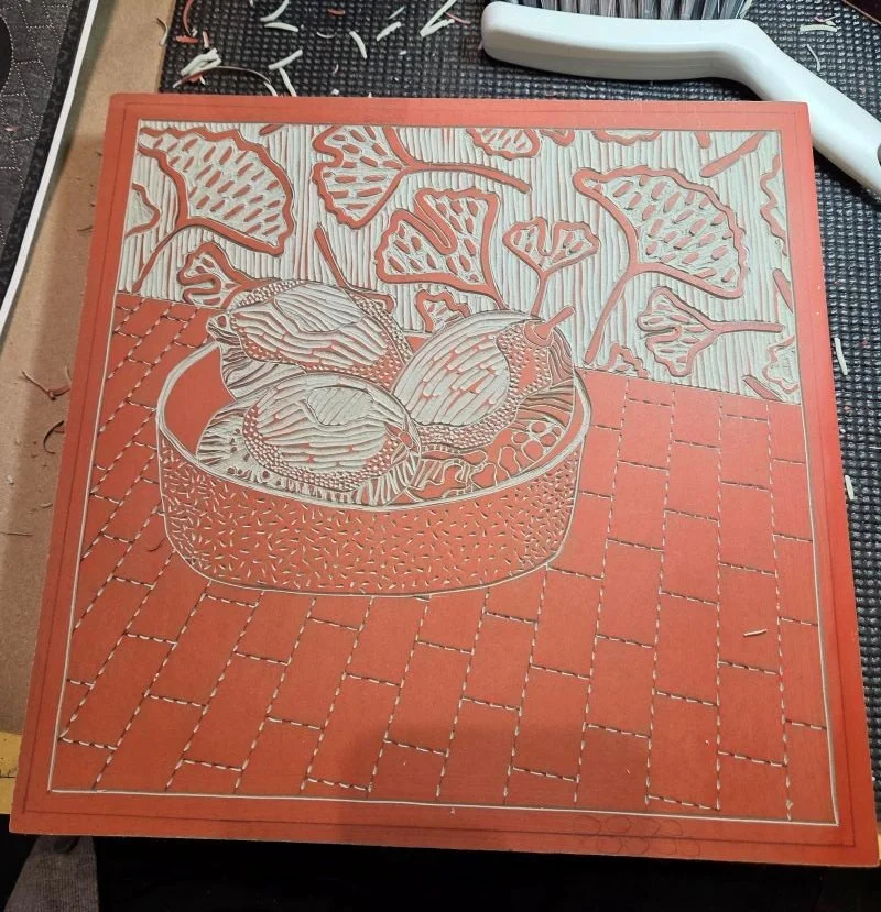 The images below relate the beginning of a new direction I want to pursue. I imagine taking imagery from fiber pieces and translating them into the vocabulary of linoleum printing while keeping the language of fabrics, embroidery, and quilting. Learning any new technique takes time and persistence. These first attempts, although rough to my eye, are an exciting beginning.